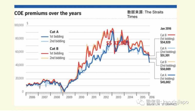 想要在新加坡拥车还要抽到拥车证,或者我们说车牌,和中国不同的是,新加坡的COE有效期是十年。拥车证根据排量和功率,以及用途,分为A,B,C,D,E 五组,每组独立竞拍,和私家车有关的是A,B。拥车证的价钱和市场供需关系以及政府政策有关,靠竞标的方式来购买的,每个月政府会两次公开拍卖一定数额的拥车证,价高者得。根据历史数据可以看到拥车证在2012年接近10万新币,可以买4辆我们现在开的小破车了。2019年12月,COE的成交价格是32889。