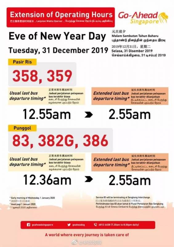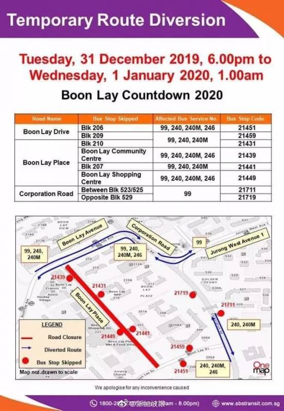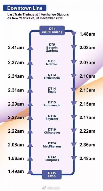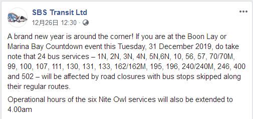 在封路开始后,停放在封路区域内的车辆将无法离开。禁止车辆停靠在滨海高速路和东海岸沿线观看烟花。警方会对肇事司机采取执法行动,并会拖走妨碍交通的停泊车辆。 2.公共运输延长营业时间接送市民: 跨年期间,公交车营业时间将延长,部分车辆最晚运行至凌晨4点,地铁的营运时间也将延长至少2小时15分。