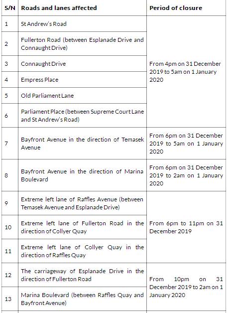 现场交通 滨海湾跨年现场预计有超过30万人次,因此若要到场观看,需要预留更多的交通时间。 1.多条马路从下午开始封路,驾车前往的民众请注意以下封路信息: