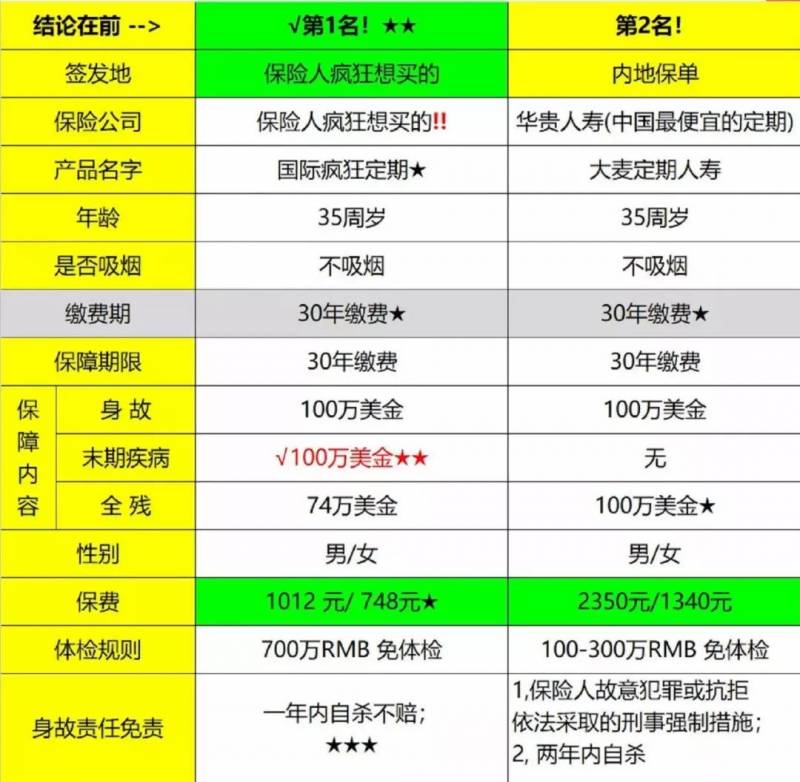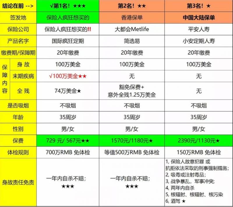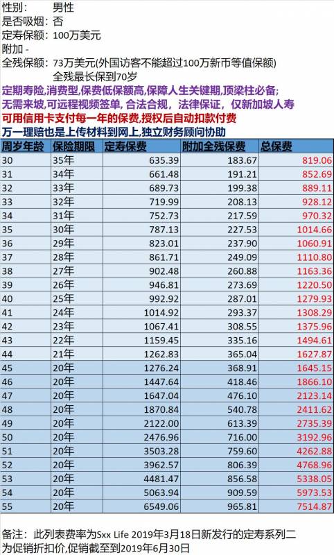 结论: 1 价格便宜到爆,是香港的一半,内地的也是 2 新加坡定寿包含了绝症保障,提前支付保额哦 3 新加坡的除外条款少 案例2: 35岁男不吸烟健康体,30年期保障,30年缴费期,保费固定不变;消费型