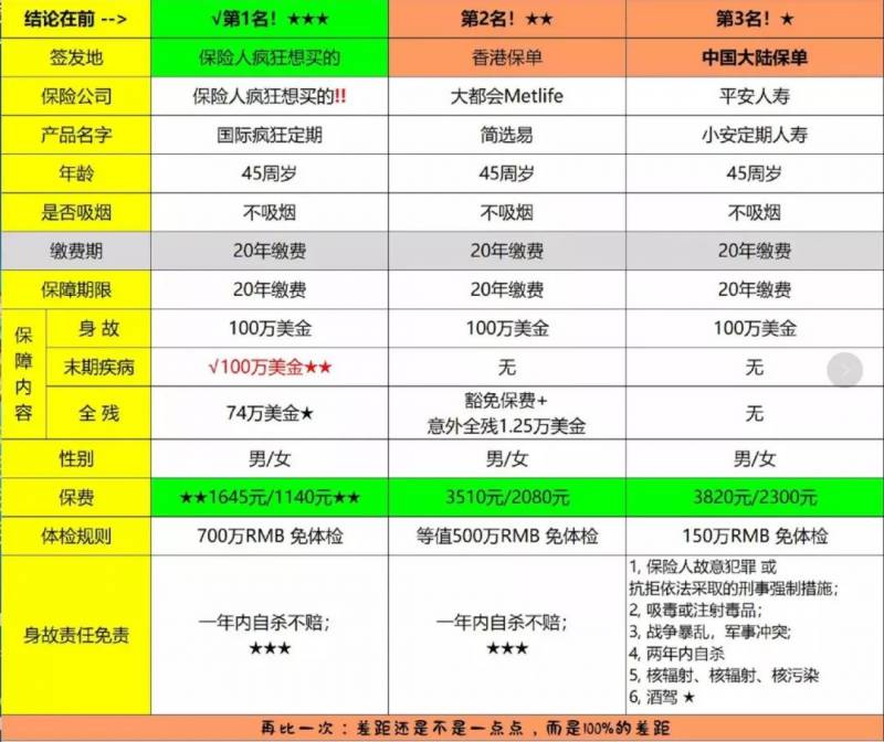 结论: 1 价格便宜到爆,是内地价格的一半 2 新加坡定寿包含了绝症保障,提前支付保额哦 3 新加坡的除外条款少 案例3: 45岁男不吸烟健康体,20年缴费和20年保障,保费固定不变;消费型