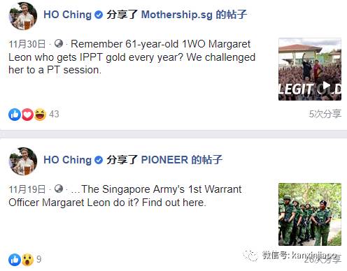图源:Pioneer Magazine 虽然年岁已高,但是这名“老奶奶”却一点也不服老,现在正在基本军训中心担任排长一职,领导著一批又一批的新兵,带领他们走向成熟的士兵生涯。 连新加坡总理夫人、淡马锡控股掌门人何晶,也在个人脸书上两次分享有关她的报道。
