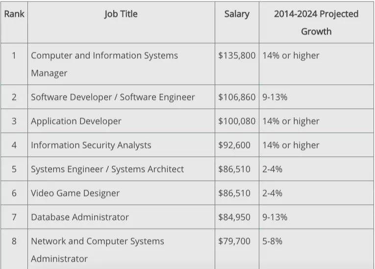美国的薪水调查公司Payscale的数据显示 美国计算机科学职业中期的 平均工资为11万美元 计算机科学是薪水最高的领域 且保持着惊人的增长率 IT行业在全球都很吃香