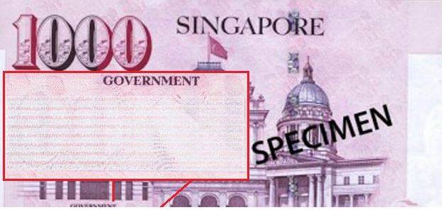 如果您有仔细看纸钞的话,您应该不难发现不管多少钱的纸钞上面有着以四种不同语言编写的“新加坡”的字样。而这行字的上面有一条直线,但您再仔细看看的话您就会发现它不是一条线,它实际上是一系列微型文本,重复了“ MONETARYAUTHORITYOFSINGAPORE”一词。