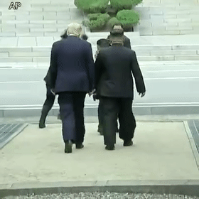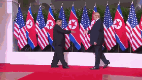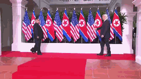 只见特朗普像个乖巧的小媳妇,静等在原地,看着迎面走来的“新郎”金正恩。