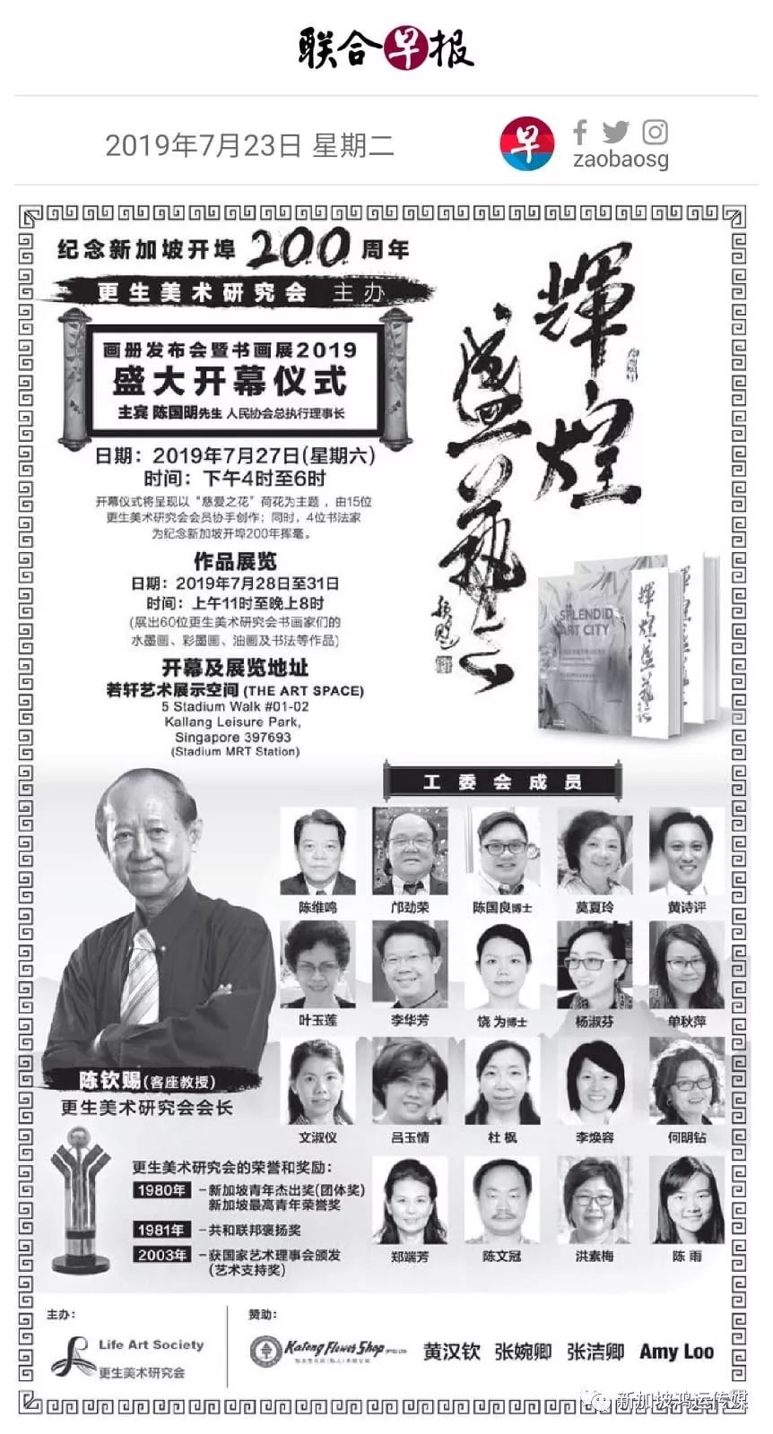 本地知名的书画艺术团体更生美术研究会(Life Art Society),为纪念新加坡开埠200周年,将从7月27日(星期六)至7月31日(星期三)在加冷娱乐广场若轩艺术展示空间(The Art Space)举办《辉煌盛艺》纪念画册发布会及展出研究会60名书画家的作品。