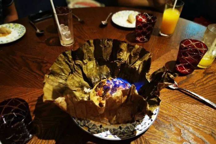 魔厨在这里的设计别有用心,荷叶包的八宝饭层层打开,浇上一层酒,点火,"呼"的一声,蓝色的火苗让你觉得新的一年要火。