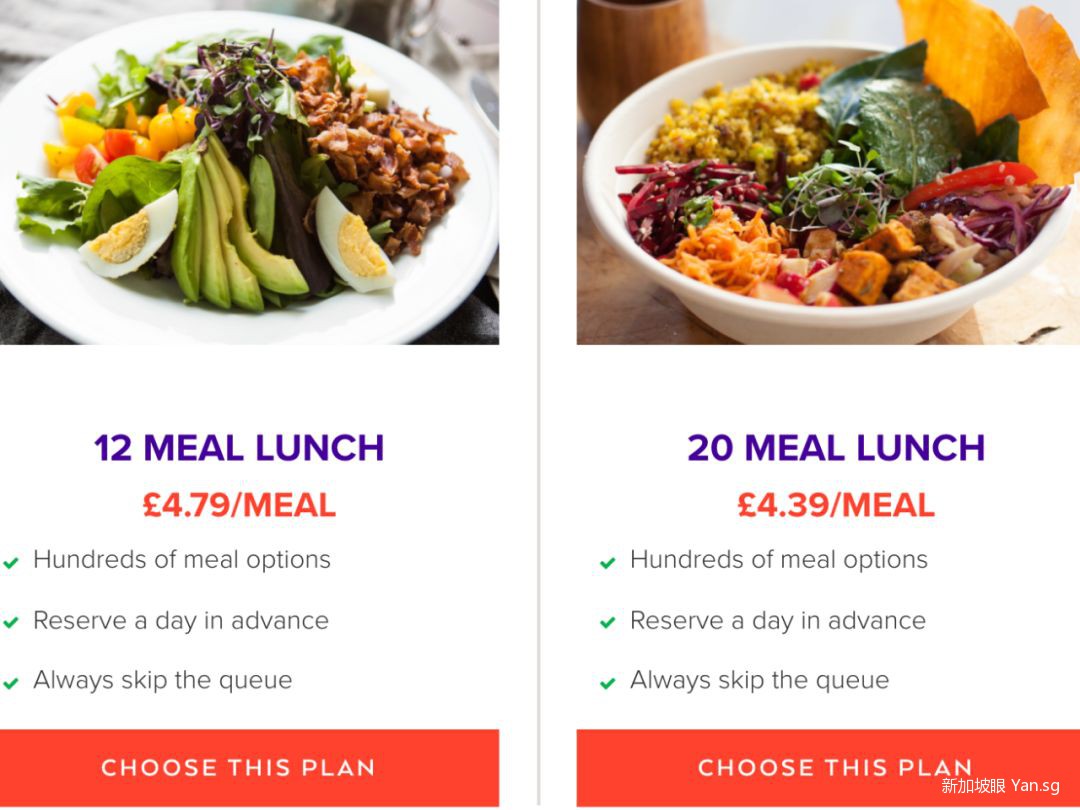 同样采用月票制度,分为每月20餐(每餐7.99新)、12餐(每餐8.49新)、6餐(每餐8.99新)。APP在CBD、乌节路和诺维娜共与超过200家餐厅有合作。
