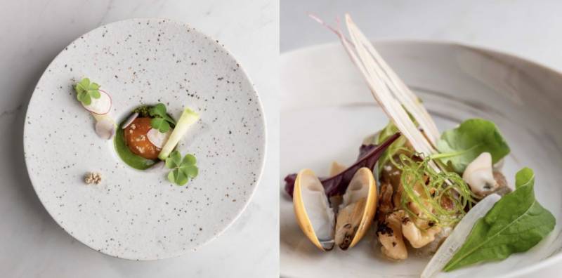 从餐前饮品就是定制化体验,来自世界各地的特色鸡尾酒、The Chita威士忌,Suze Gentiane,Umeshu Kanjuku Ume等等。这里也有套餐可以选择,五道菜($98)、七道菜($168)或者十道($218)。