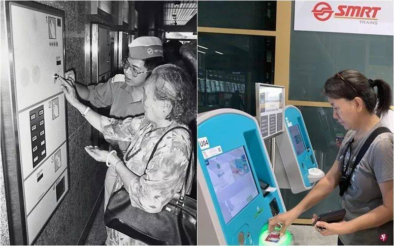 左:第一代地铁列车启用时,地铁人员教导公众如何购买车票。他们必须在售票机投入银角,并按下正确的按钮。右:时隔30多年,如今多数乘客都使用易通卡,易通卡的自助充值器也改为触屏。