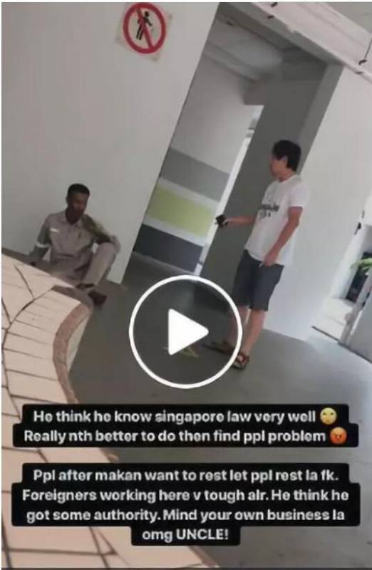 同样是去年,一名客工在组屋区屋楼下纳凉小憩,一大叔却非常有意见,还很无理地破口大骂躺在组屋底层小休的客工。
