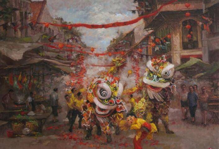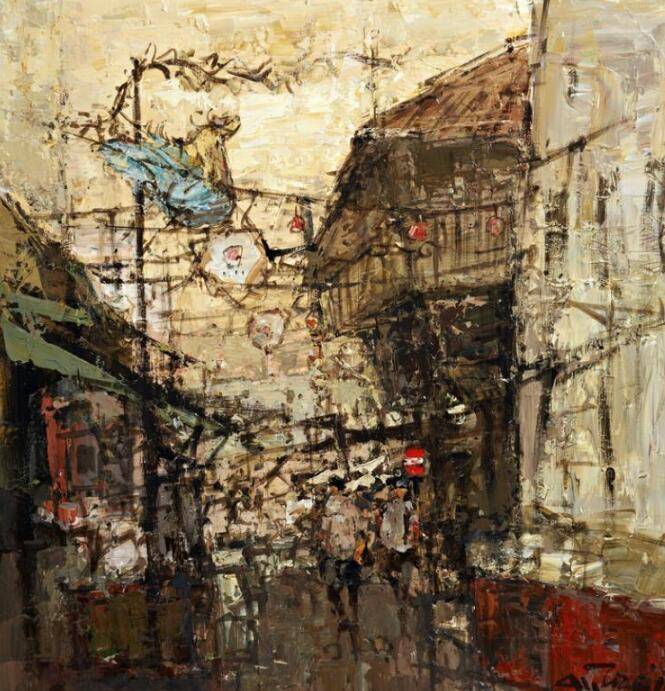 洪亚弟(77岁)后期创作从油画转向亚克力,以半抽象化,比较随意的笔触去捕捉牛车水街道的风景。