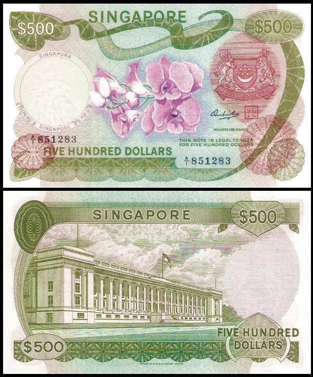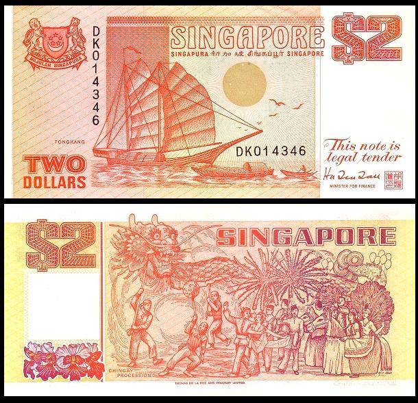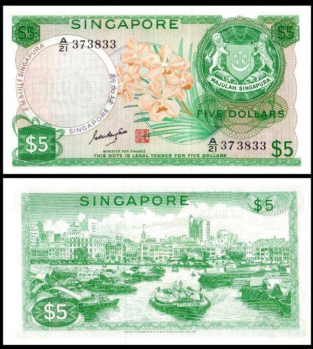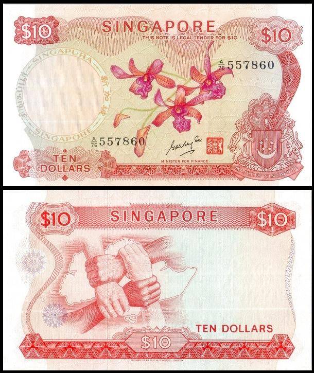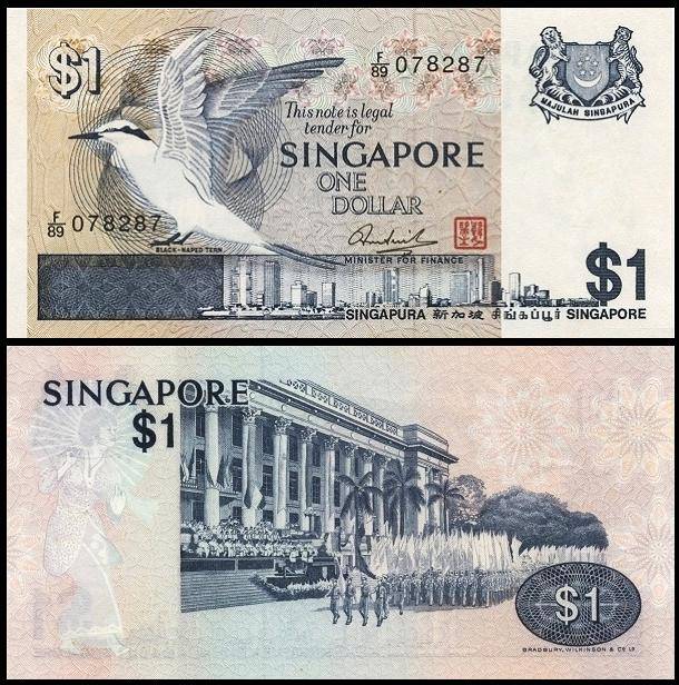 1965年8月9日新加坡被迫退出马来西亚联邦宣告独立,但仍继续使用了几年马来亚与英属婆㑩洲的纸币,直到1967年开始发行自己的钞票,至今新加坡元共有四套,除了目前流通的第四套,历史上的三套钞票分别称为“花、鸟、船”版。第一版花版,1元钞票。