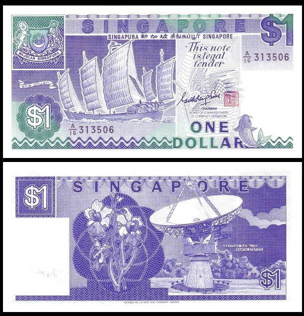 第三套新加坡纸币以船为主要图案,称为“船”版。第三版船版,1元钞票。背面图案为圣淘沙卫星地球站。