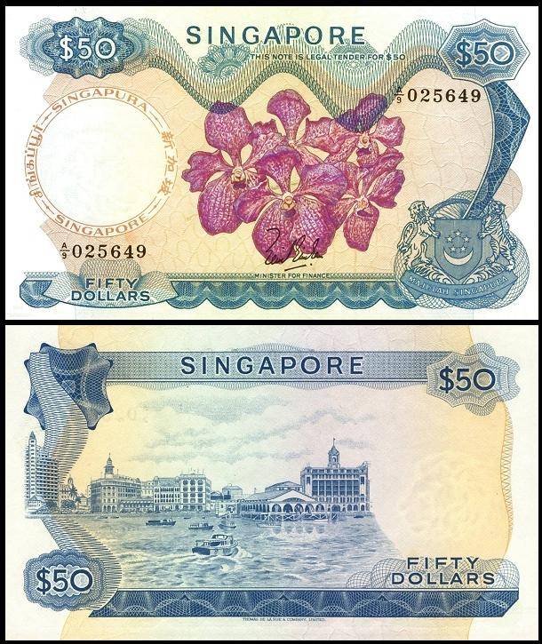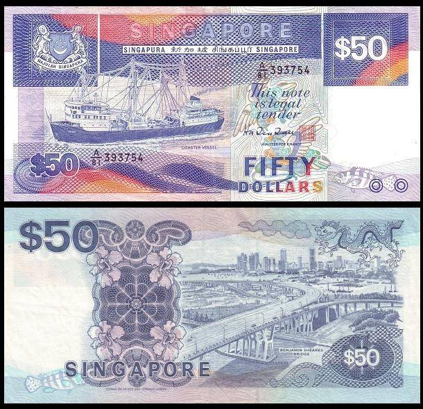 第一版花版,50元钞票。背面主景图案为新加坡滨海区和克里福德码头。