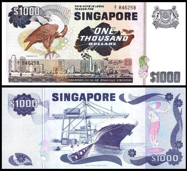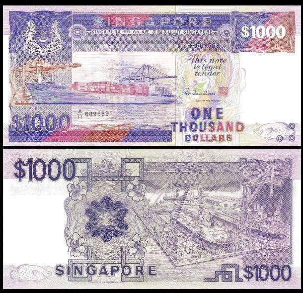 第一版花版,1000元钞票。背面主景图案为新加坡维多利亚纪念堂和皇后宫。