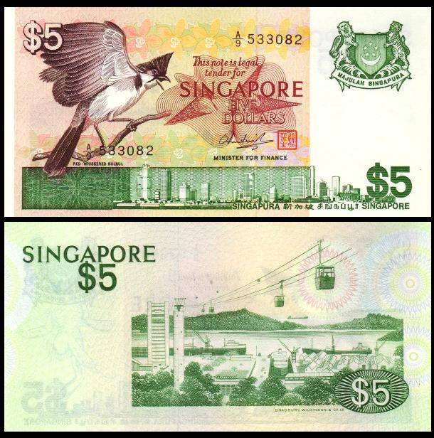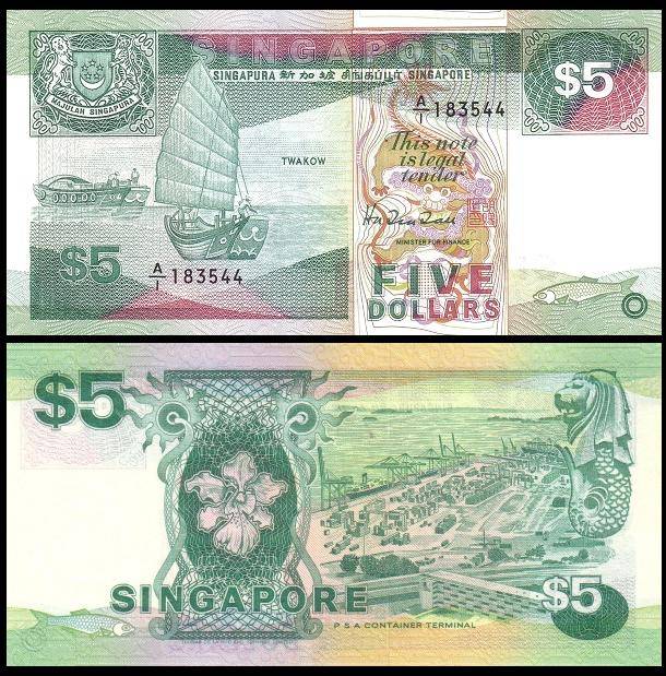船版纸币于1984年发行,到1999年结束。第三版船版,5元钞票。背面图案为新加坡港务局货柜码头。