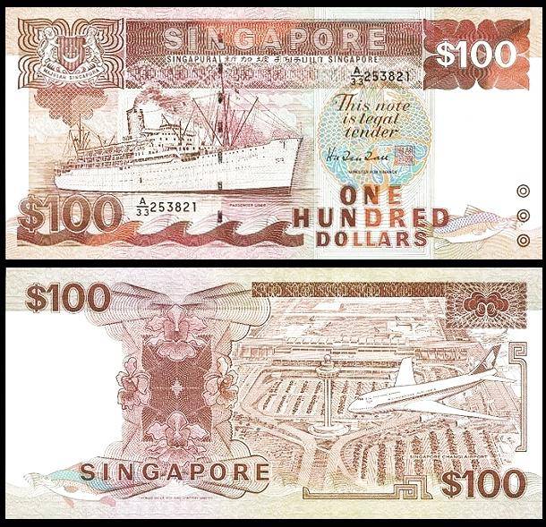 第三版船版,100元钞票。背面图案为新加坡樟宜国际机场和新加坡航空公司。