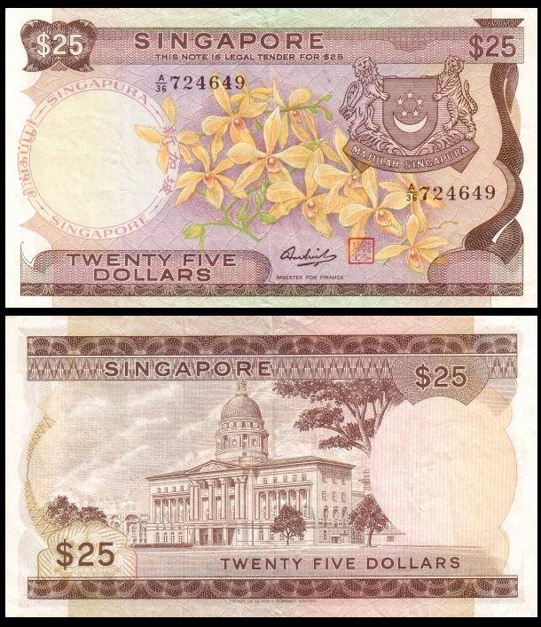 背面描绘的则是新加坡的公共建筑和海滨、河流风光。第一版花版,25元钞票。背面主景图案为最高法院大楼。