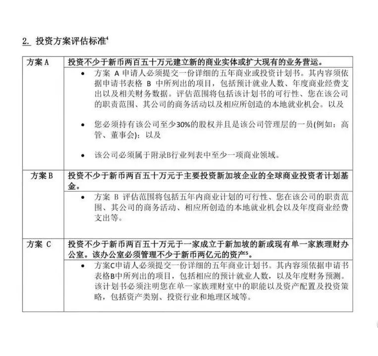 2亿是门槛,除此之外,想投资移民必须在新加坡投资至少250万新元建立新的商业实体,或者扩充现有的商业运营,或者投资至少250万新元予一支全球商业投资者计划基金。