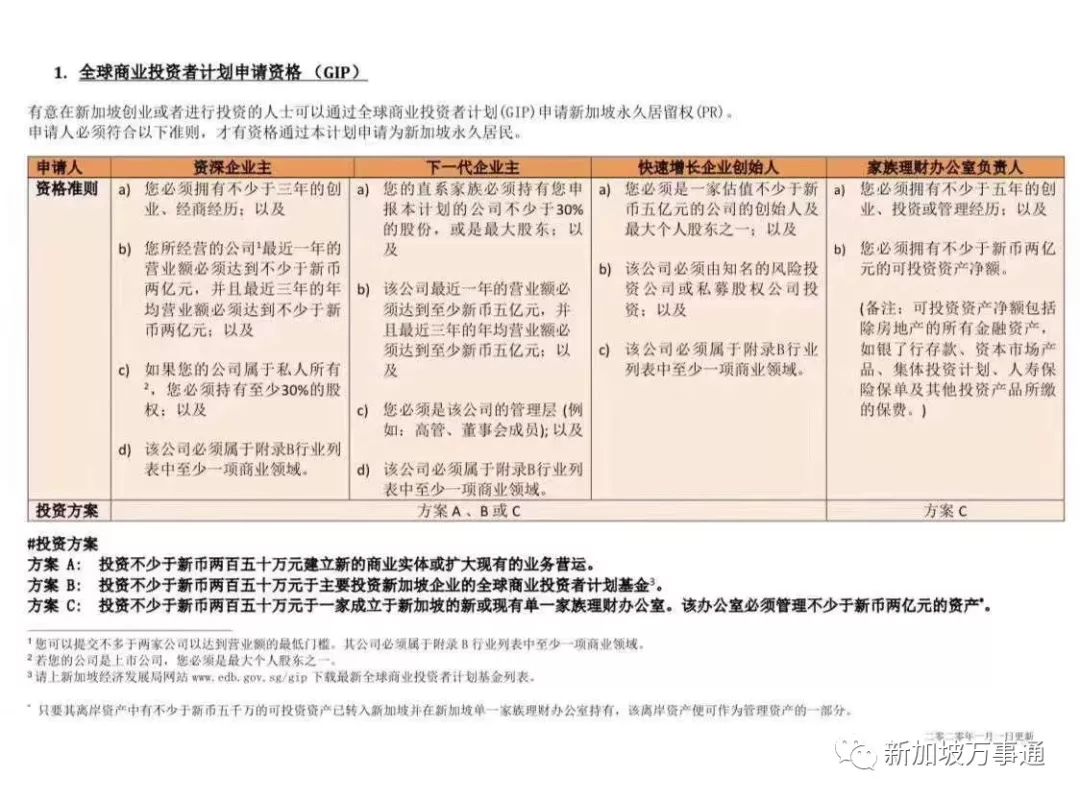 众所周知,有兴趣在新加坡创业或者进行投资的投资者, 可以通过全球商业投资者计划(GIP)申请新加坡永久居留权(PR)。我们称之为投资移民。