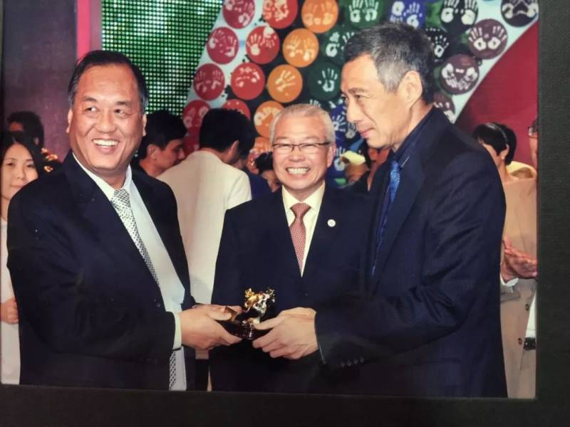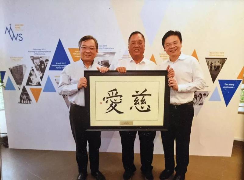 刘智评(左)为仁慈医院捐款,李显龙总理(右)为他颁发纪念品,中为仁慈医院主席蔡天宝
