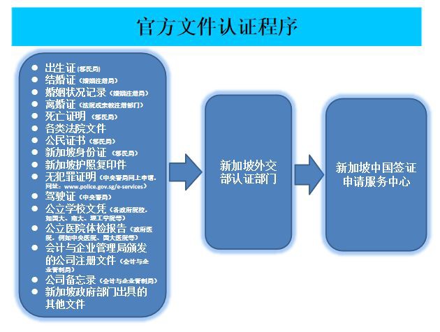 对于第三国护照、结婚证书、出生证等官方文件,经过第三国驻新加坡使馆证明,且新加坡外交部认证,中国驻新加坡大使馆可视情况予以认证(需经中国签证申请服务中心递交)