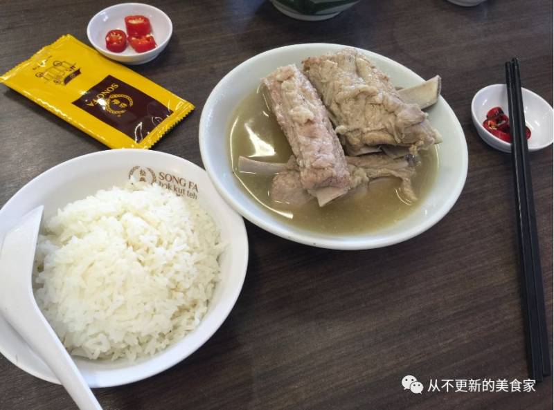 肉骨茶汤味道会比较冲,喝进口的汤有着浓浓的胡椒味。碟子里的小米椒是配着酱油用来作为排骨的蘸料,有一说一确实很下饭。比起JurongPoint的另一家肉骨茶,YK和我都觉得松发的更好吃