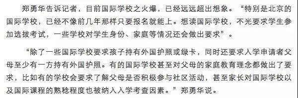 并且,国内的国际学校,入学条件严苛,不光要求学生参加选拔考试,一些学校门槛更是五花八门,对学生身份、家庭等情况还会做出要求。 有的国际学校要求孩子持有外国护照或绿卡,同时要求父母至少有一方有外国护照,有钱有外籍,还不是进入国际学校的全部门槛,还包括孩子的英文水平和家长的空闲时间。