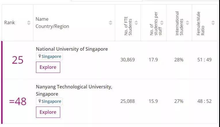 在泰晤士高等教育THE世界大学排名里,新加坡国立大学的排名与清华、北京大学(23/24)相当,高于香港地区排名最高的香港大学(35)。
