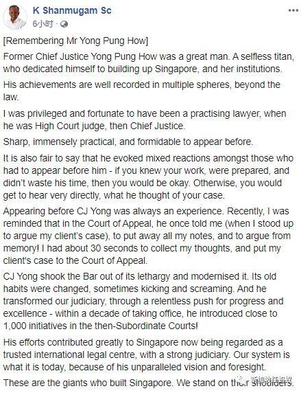 “他的努力为新加坡做出了巨大贡献,如今新加坡被视为一个值得信赖的国际法律中心,拥有强大的司法体系。我们的司法体制之所以能有今天的样子,归功于他的独特眼光与远见。”