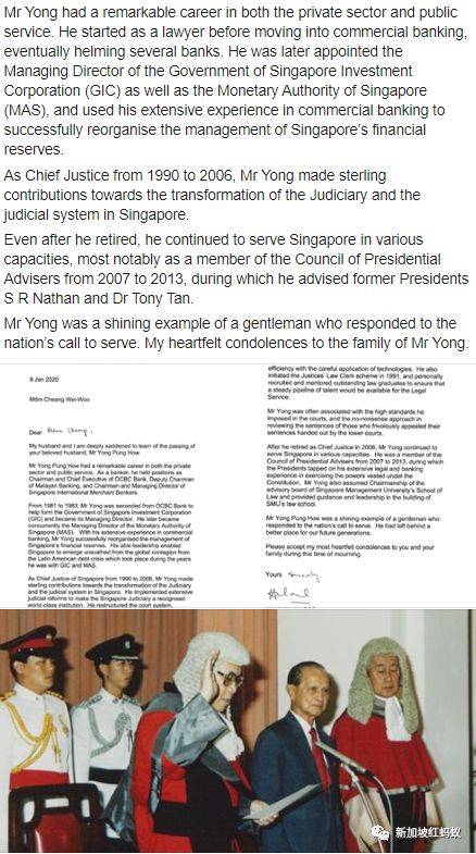 总统在唁函中指出,杨邦孝在1990年至2006年担任大法官期间,对司法界的转型和新加坡司法制度做出卓越的贡献。