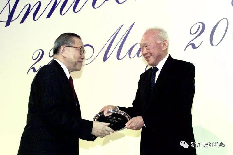 杨邦孝(左)加入司法界之前,也曾出任新加坡政府投资公司执行董事,图为2001年政府投资公司( GIC )20周年晚宴上,已故建国总理、也是政府投资公司主席的李光耀资政,颁发纪念牌给政府投资公司董事部成员之一的杨邦孝。(联合早报档案照)