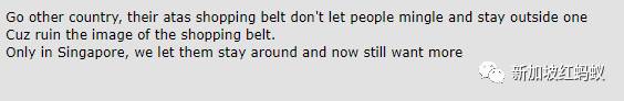 “去其他的国家,他们高级的商圈禁止人闲逛逗留,因为会影响商圈形象。只有在新加坡,我们会让他们逗留,现在还得寸进尺。”