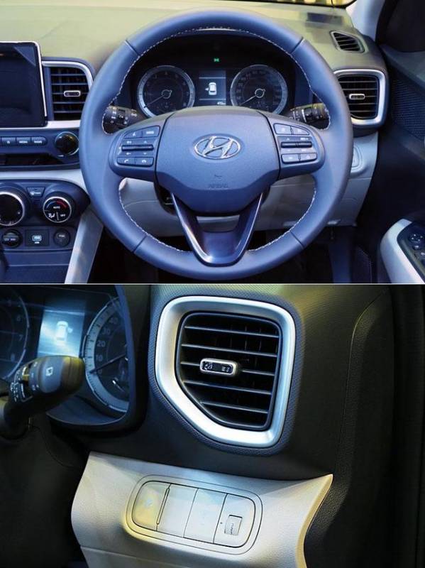 内饰部分,Venue 的风格与近期 现代新车相近,中控设计重心以中央娱乐系统为主。并采用 现代新世代的三辐式多功能方向盘。不过不同于 Kona,Venue 将空调出风口设计于荧幕两侧,并将外观 Two-Tone 的设计延续至内饰,形成上深下浅,充满活力的内饰配置, 并全车系标配 8 吋触控式多媒体影音,具有 Apple CarPlay 及 Android Auto 连接机能等功能。
