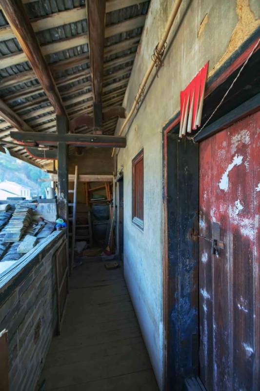 汉族的门神是一对强强组合,貌似凤凰传奇,一左一右一唱一和,唱着《祝你平安》,唱着《最炫门神风》。中国最早的门神是“神荼”“郁垒”,演变到元代以后渐渐被“秦叔宝”“尉迟恭”替代,王灵官、钟馗、包公诸君也曾客串过门神一阵子。但党溪村不请门神,而是门楣正中贴一张撕开成5片的红纸,很有客家特色。
