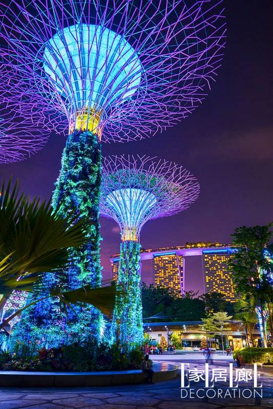 入夜,五彩灯光和投射的多媒体影像将这座垂直花园打扮得妖娆多姿。两棵擎天大树之间有空中步道相连,方便游客从不同的角度欣赏滨海湾花园的美景,与滨海湾金沙相望。