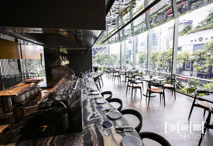 步入V Dining, 整个空间有一个高高的天花板,周围是落地高玻璃幕墙。餐厅特别靠近玻璃幕墙,俯瞰下面的主要道路,用餐者可以欣赏户外全景。反光天花板设计使空间更加有趣和崇高的同时,我们也能直接看到佳肴通过V-ZUG瑞族厨房电器被烹饪制作的全过程,如同一个V-ZUG瑞族所塑造的家庭社交生活的演绎场景,融合了烹饪、餐饮、社交、产品互动等多维度的场景体验。