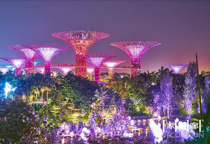 新加坡滨海湾花园(Gardens by the Bay)由三个风格各异的水岸花园连接而成,其中包括两个植物冷室 :云雾林和花穹,展示最优秀的热带园艺和园林艺术,拥有大量的热带花卉、色叶植物等。花园中央还有 18 棵“擎天大树”,“树冠”白天可以遮阴。