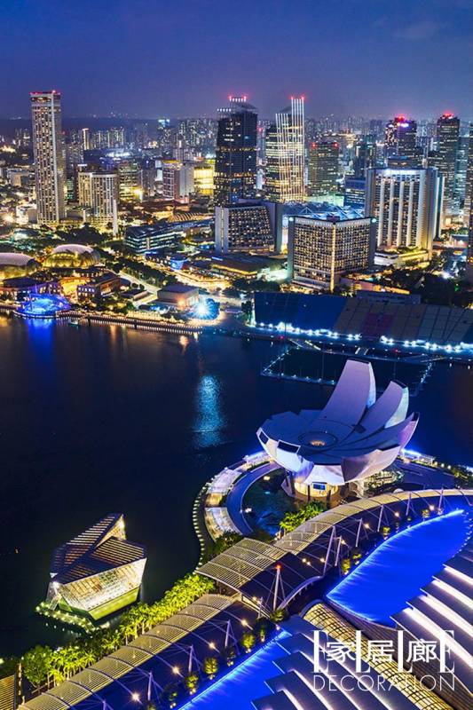 滨海湾夜景可以看到如莲花盛开的新加坡艺术科学博物馆(Art Science Museum), 同 样 由Moshe Sadie 设计。一旁“飘浮”著的“水晶阁”是 Louis Vuitton Island Maison,由Peter Marino 设计。 国立美术馆