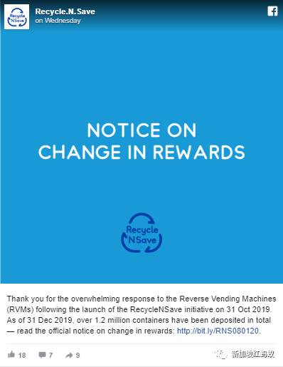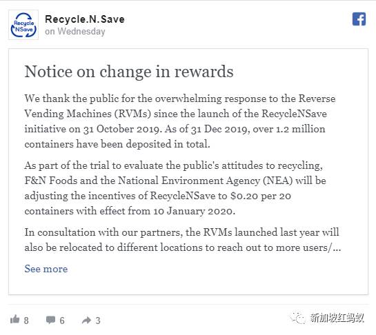 问题很快浮现没想到,这个对民众来说特别“划算”的福利,两个月后就成了昙花一现的美梦。本星期三(1月8日),“回收和节省”(Recycle N Save)面簿发出公告,带来了一个好消息和一个坏消息。自环保反向贩卖机在去年10月底启用后,受到广大民众的积极响应,截至12月31日已经回收了超过120万个空瓶。这还真是件可喜可贺的事,毕竟这代表了120万个空塑料瓶被正确的循环回收了。这些塑料瓶若是扔进组屋底下的回收垃圾桶内,很可能会被其他环保意识不强的居民将其他垃圾扔进去,污染了塑料瓶。