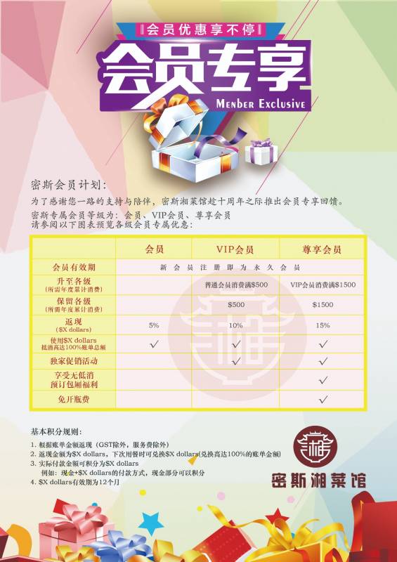 *以上优惠, 两个金额折扣不可同享, 两个送菜活动不可同享, 1个金额折扣可与1个送菜活动同享 *不分桌,不分单 *公共假期及农历新年期间不适用 *密斯湘菜馆拥有活动最终解释权