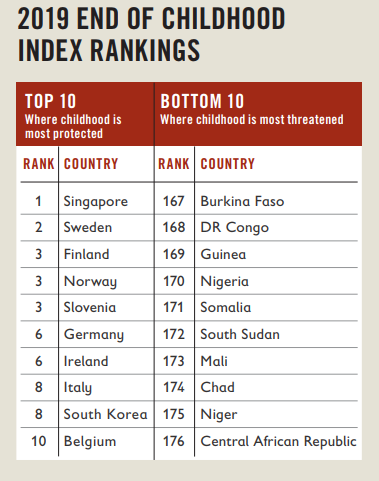 国际非政府组织“救助儿童会”(SaveThe Children)发布的2019《童年终结数据》报告中,新加坡再次被评为最适合孩童成长的国家。在这份排名中,排在前10名的亚洲国家只有两个,韩国排在第8位,日本排在第19位。