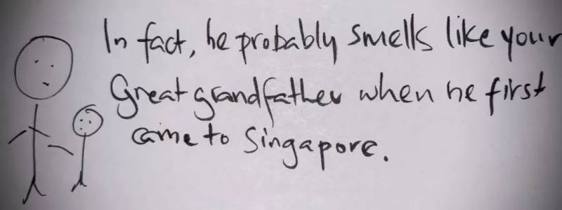 新加坡的地铁上,一个小孩问爸爸:我可以不跟外劳坐一起吗?他好臭!哪知爸爸对孩子说:那是一个一天要工作14个小时的人的味道,是他对家庭思念的味道,甚至闻起来可能像你爷爷来新加坡落脚时,身上的味道。
