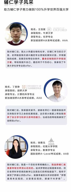 1.其中近三分之一的同学获得了ABB以上的成绩(该成绩可申请世界排名前50的大学的部分专业),超过60%的同学获得了BCD以上的成绩(该成绩可申请世界排名前100的大学的部分专业)。要知道所有同学都是在没有经过入学筛选的情况下,通过在辅仁的学习获得如此骄人的成绩,相信随着今后入学考核和教育管理的逐步完善,辅仁成绩还将再创新高。