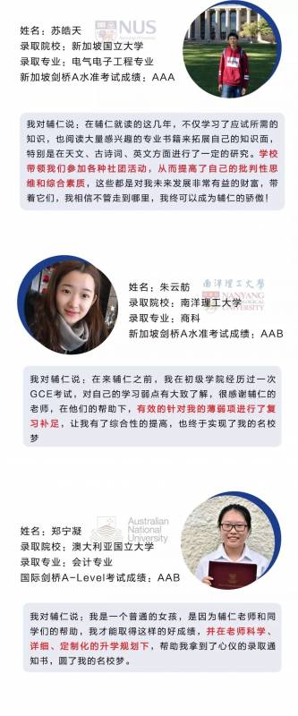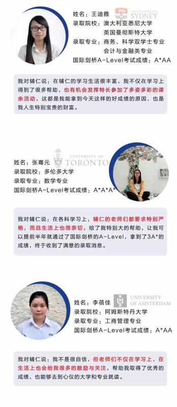 学生寄语:剑桥国际A-Level与高考所要考察的内容还是很不同的,虽然宽泛但并不困难,所以在这方面只要能紧随老师们,一定会得到你们想要的成绩。