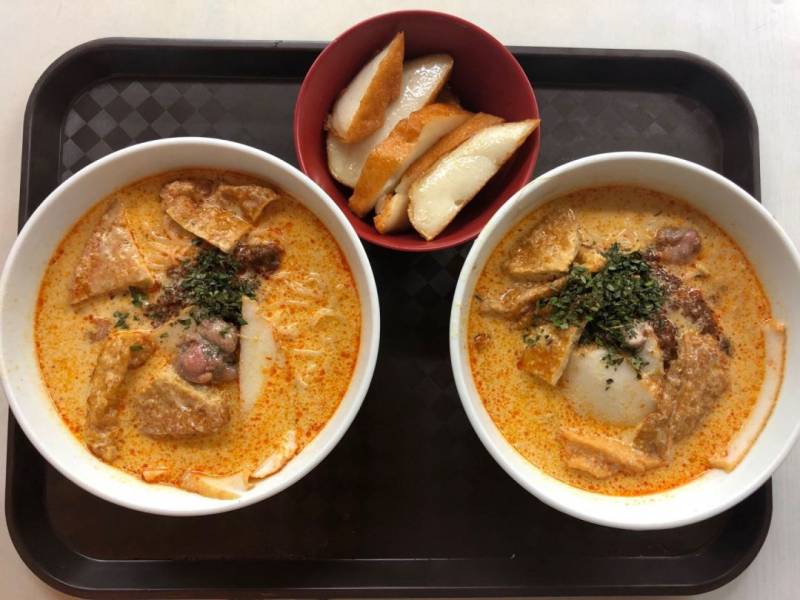 鲜艳的咖喱黄,每一勺都充满浓郁椰浆的香味。 我们要的细米粉,佐料有对半切开的白煮蛋、豆芽、豆乾和鱼饼,最讲究的是生的狮蚶。 沾著汤汁,味蕾幸福到爆炸。