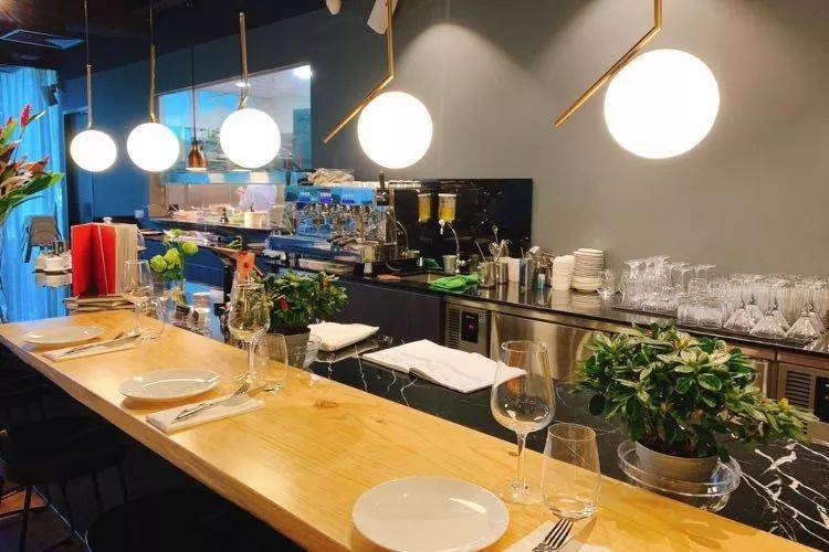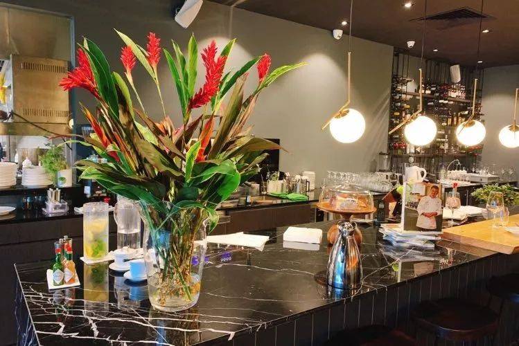 新店的风格,是我心水的开放式厨房,黑色主色调,搭配着大瓶艳丽的天堂鸟花,爱了爱了。
