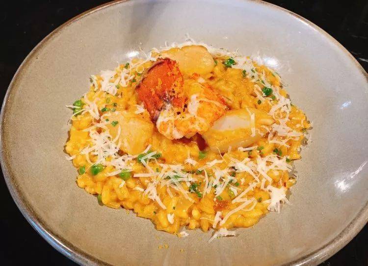这一盘金灿灿的炖饭,番红花给的太慷慨了吧!至于里面的龙虾肉扇贝肉,个大肉鲜,吃起来香甜的很,龙虾肉混着火候适当的炖饭,番红花的香味直达味蕾,放进嘴里的一瞬间,真是享受。