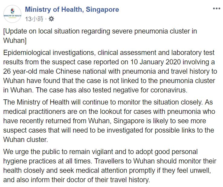 1月10日,新加坡卫生部曾紧急发文,提到一名26岁中国籍男子被检查出患有肺炎,正进行隔离治疗以防万一。昨晚,新加坡卫生部再次发文,证实曾到访武汉的这名26岁中国籍男子,与武汉新型冠状病毒感染病例无关,对冠状病毒呈阴性反应。